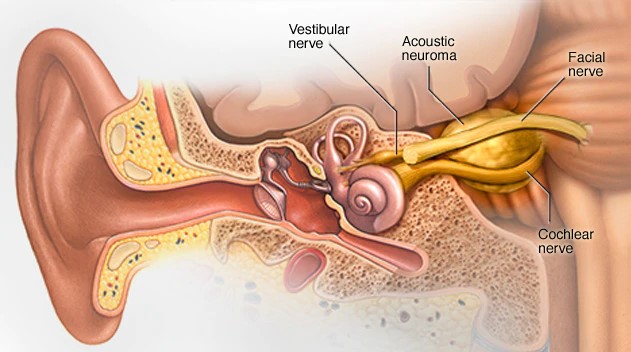 Neuroma do acústico, geralmente, forma-se na porção coclear do nervo vestibulococlear, que é responsável pela audição e pelo equilíbrio, localizado entre o cerebelo e a região da orelha. O neuroma do acústico é um tumor benigno mais frequente em mulheres de meia idade.