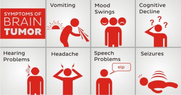 Sintomas de tumor no cérebro podem incluir mas não estão limitados a vômito, alterações de humor, declínio cognitivo, problemas de audição, na fala, no tato, no olfato e na visão, dores de cabeça, fraqueza ou paralisação de um braço, uma perna ou de um lado do corpo e convulsões.